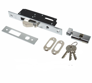 Cerradura marca FEH manija Barú para alcoba con llave-botón.