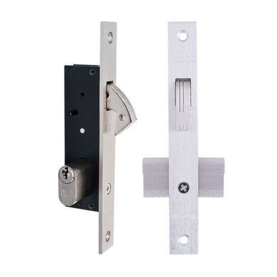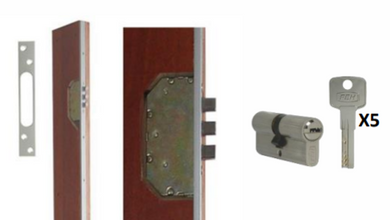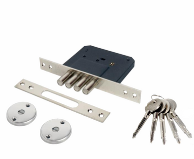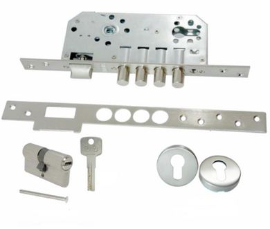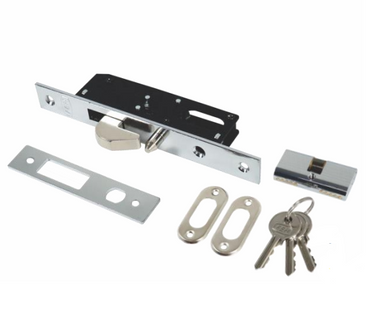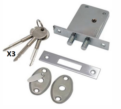 Cerradura de embutir o incrustar para puertas batientes tanto derechas como izquierdas. Backset (medida entre el borde de la cerradura o puerta hasta la mitad del cilindro) de 45mm. Para puertas de 30 a 60mm de espesor. Ideal para puertas de perfil de aluminio. Cilindro redondo tipo llave-llave, cuanta con su juego de manijas, fija en la parte externa, móvil en la parte interna para abrir por ese medio.