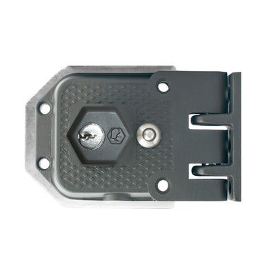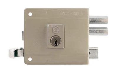 Cerradura Ideace Duralock para puertas y rejas que abren hacia el interior o puertas corredizas. Botón seguro. Tipo candado con macho vertical. Perilla para retraer el macho desde el interior. Platina y recibidor soldables. INSTALAR CON CENTRO A 60 MM.